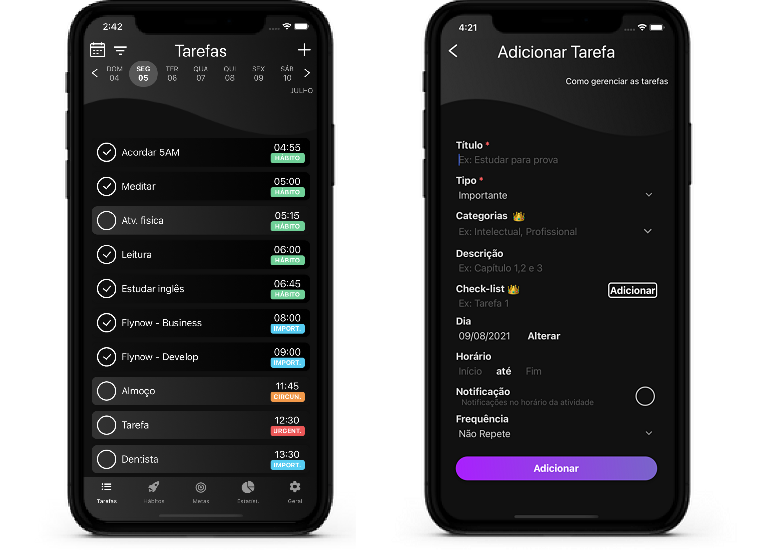 Viu como é simples adicionar uma tarefa no app? Para ser mais produtivo e se organizar melhor, sugerimos que você faça o seu planejamento semanal ou diário e repita o mesmo processo com todas as tarefas. No planejamento semanal ficará tudo mais fácil, já que você só precisará adicionar as atividades uma única vez e durante a semana inteira você poderá acompanhá-las.